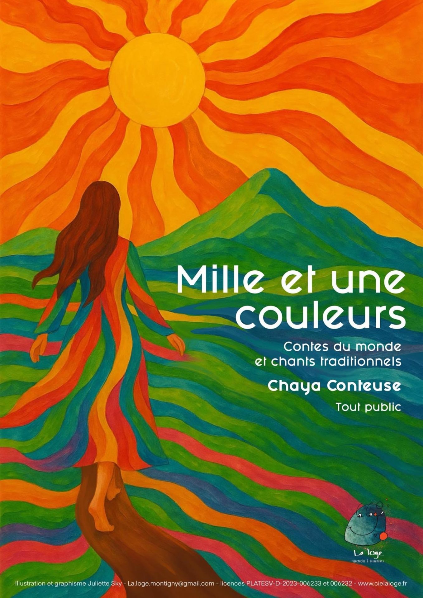 Mille et une couleurs« Mille et Une Couleurs » est un voyage autour du monde dont l’itinéraire est changeant selon les découvertes, les apprentissages et les envies de la conteuse. Chaque conte est accompagné d’un chant traditionnel du même pays, et d’instruments de musique. Le décor est fait de tissus traditionnels colorés.
